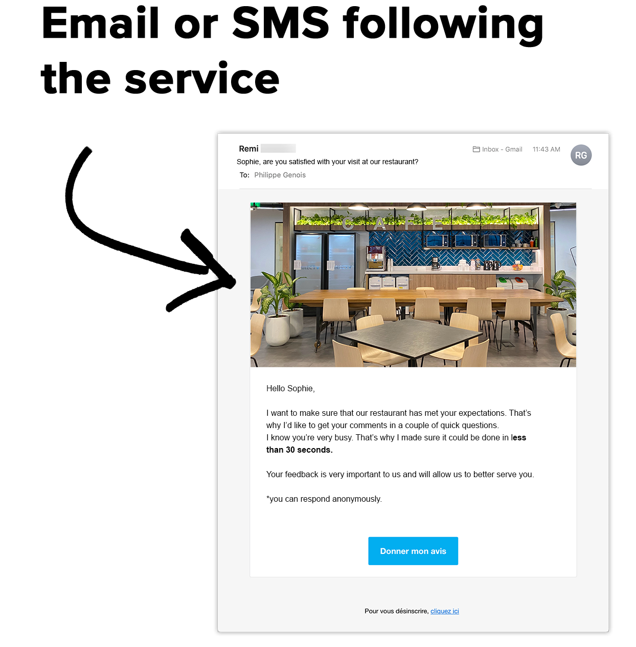 Your customer receives a personalized message right after service, when their experience is still fresh. The email or SMS reflects your brand image and optimizes the open rate.